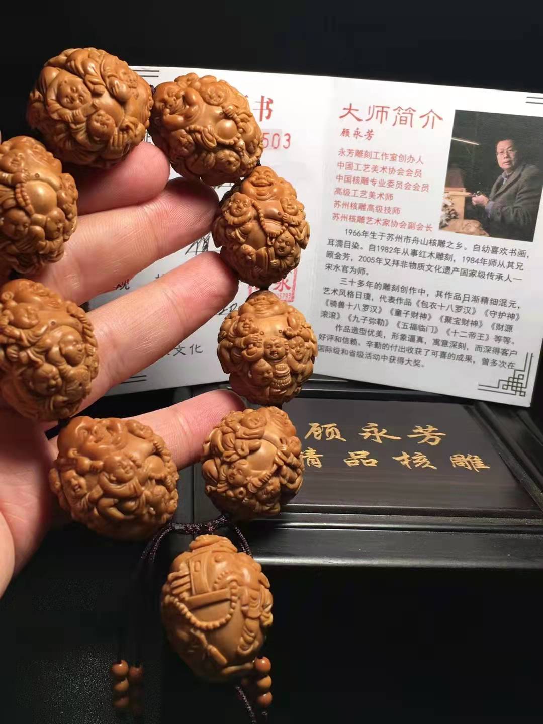 4、本站列出的核雕名家均与本站建立良好的合作伙伴关系,在您收到作品半年内,若手串或挂件部分颗粒出现自然开裂,擦破,小面积污染的情况,我们会联系核雕师为您填补,可能视情况而相应收取部分人工费用。